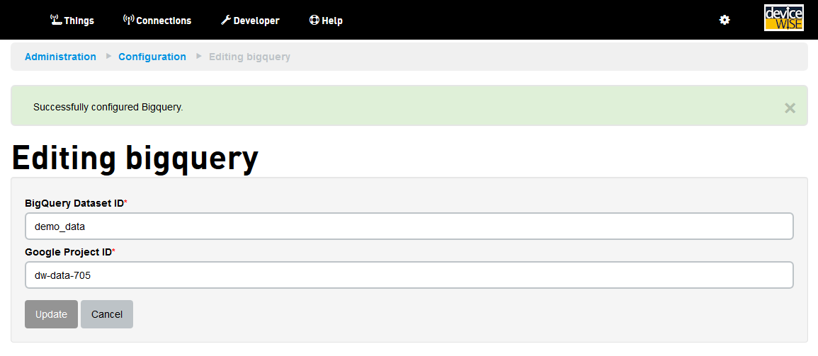 - 输入 BigQuery 数据集 ID 和 Google 项目 ID 的值,然后选择 Update(更新)。