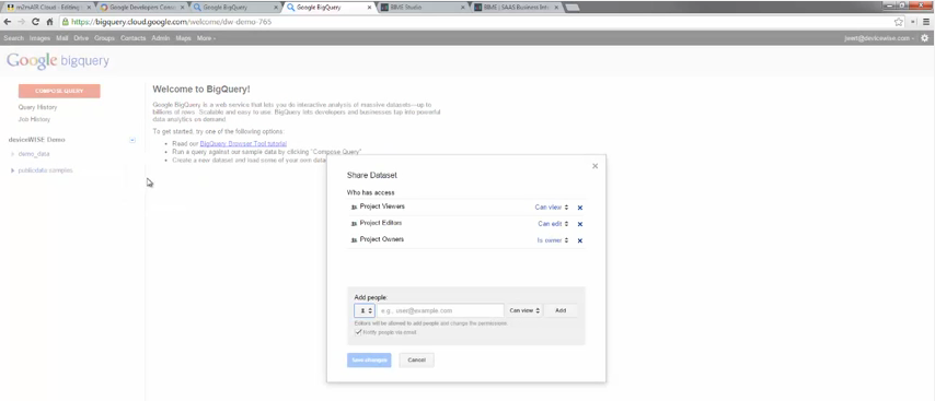 - BigQuery 数据集 ID 必须与来自 BigQuery 页面中物联网设备管理门户的服务帐号共享。