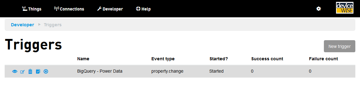 - 选择 Developer(开发者)-> Triggers(触发器)链接,显示 Triggers(触发器)页面和您的云触发器: