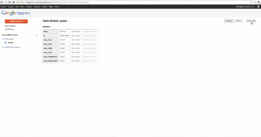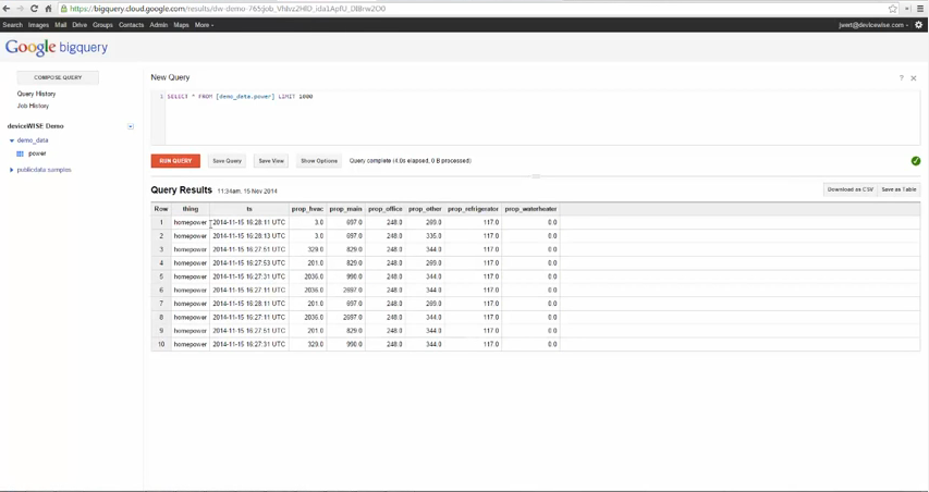SELECT * from [demo_data.power] LIMIT 1000 - 查询结果将显示已发布至 BigQuery 表的数据