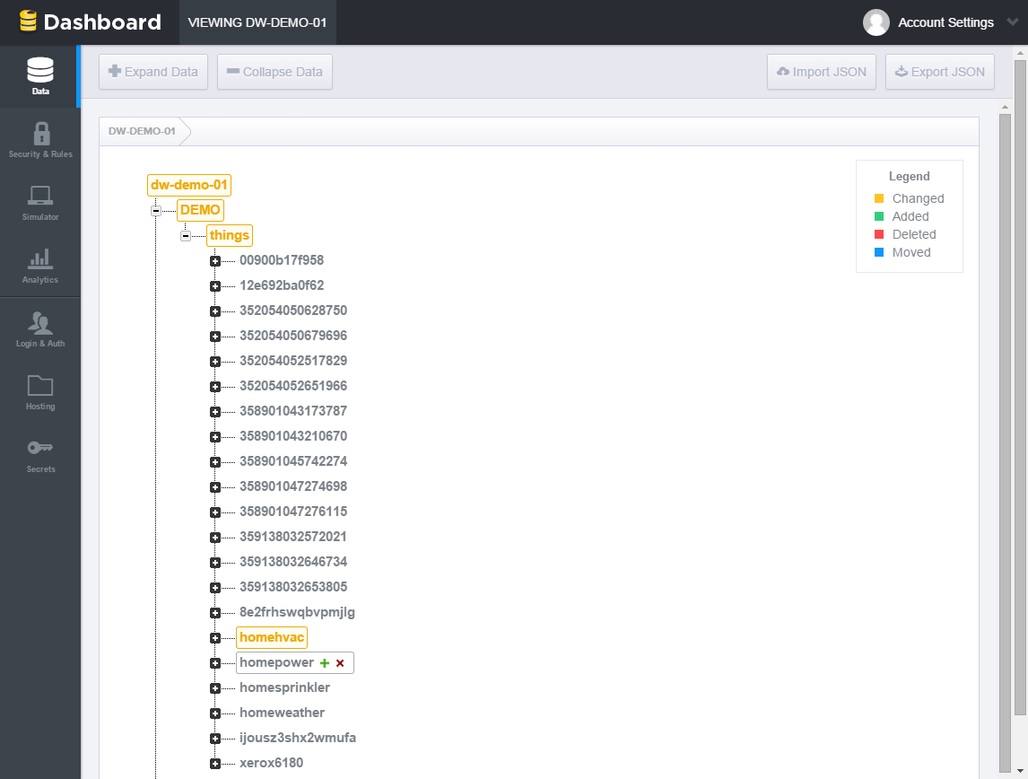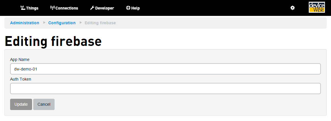 输入 App Name(应用名称)和 Auth Token(身份验证令牌)的值,然后选择 Update(更新)。 如果您不想使用身份验证,可以将 Auth Token(身份验证令牌)字段留空。 - 更新完配置后,物联网设备管理门户中“物”对象的任何更改都将发布至 Firebase,并且可以在 Firebase 仪表板中查看相关信息: