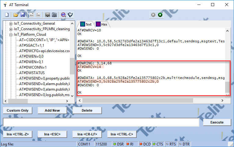5c928a25fe2a135775802c2b在理想情况下,此消息需要从应用中生成。AT#DWSEND=3,5c928a25fe2a135775802c2b,0此 ACK 已确认收到消息,并且 Processing(处理)按钮已切换回 Execute(执行)。