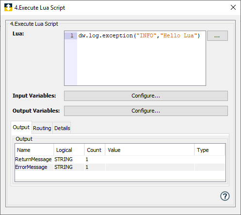 脚本执行结束时将由 Lua 脚本返回的变量。使用 Configure...(配置…)添加输出变量时变量窗口添加输出变量时,变量也将添加至 Output(输出)选项卡。 |