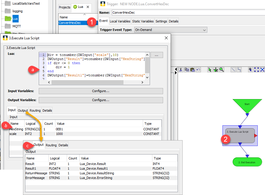 LUA 脚本定义为将十六进制值转换为十进制值并将其写入设备输出变量。要使用示例,请执行以下操作: