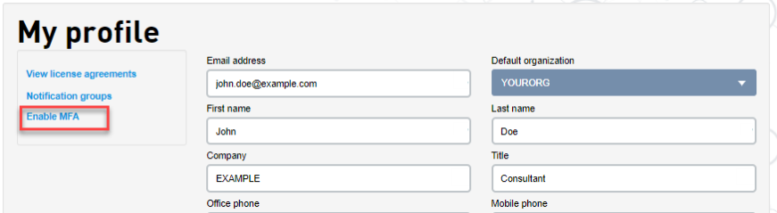 随即显示 My profile(我的配置)界面。 - 单击 Enable MFA(启用多因素身份验证)