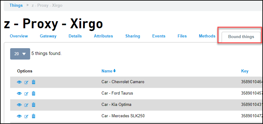 当子物绑定到父物时,父物将显示 Bound Things(绑定的物)选项卡,并列出绑定到其的所有物。物通过父物连接到物联网设备管理门户。下图显示了通过 Xirgo 代理连接的汽车。